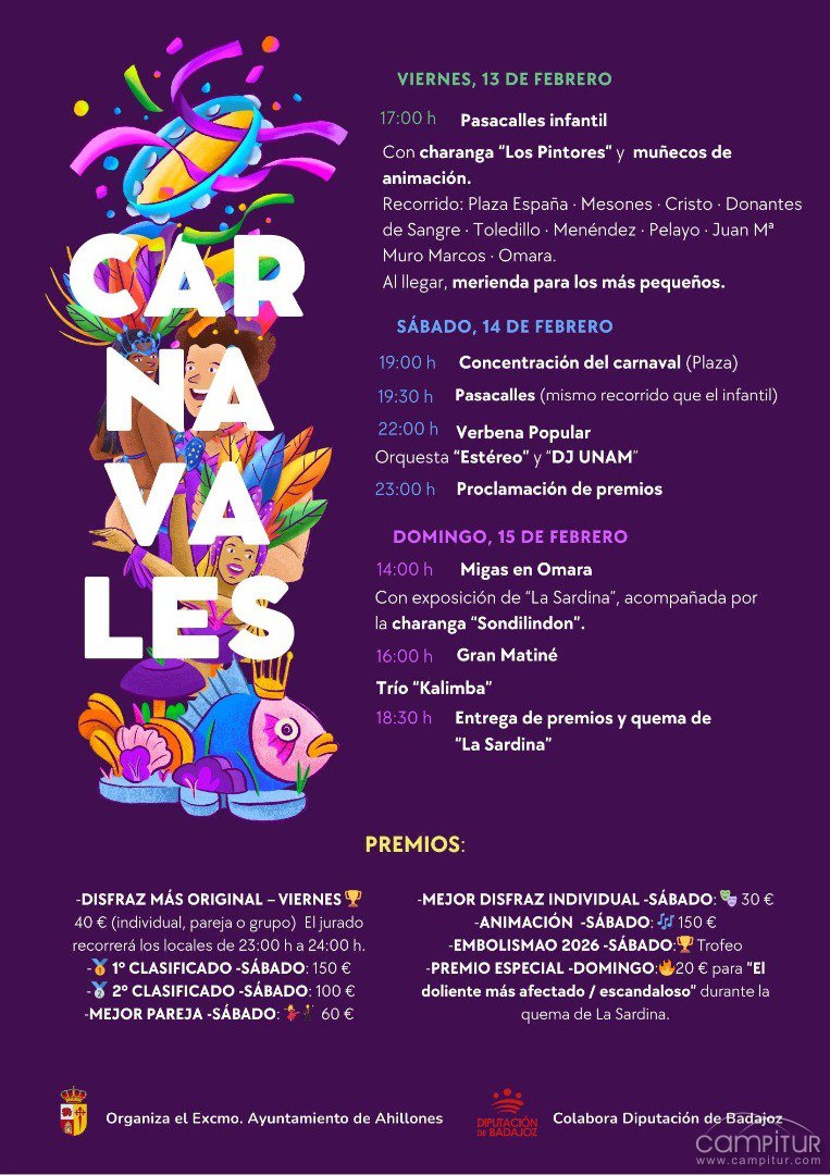 El Carnaval está organizado por el Excmo. Ayuntamiento de Ahillones y cuenta con la colaboración de la Diputación de Badajoz, invitando a vecinos y visitantes a sumarse a una celebración que promete música, humor y tradición durante todo el fin de semana.