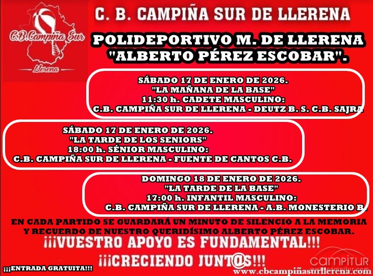 El domingo 18 de enero de 2026 se cumplen diecinueve años del fallecimiento de nuestro queridísimo Alberto Pérez Escobar. Desde el C.B. Campiña Sur de Llerena, recordaremos siempre a la luz que nos guía en este camino. En todos los partidos que disputen nuestros equipos durante el próximo fin de semana se guardará un respetuoso minuto de silencio en su memoria.